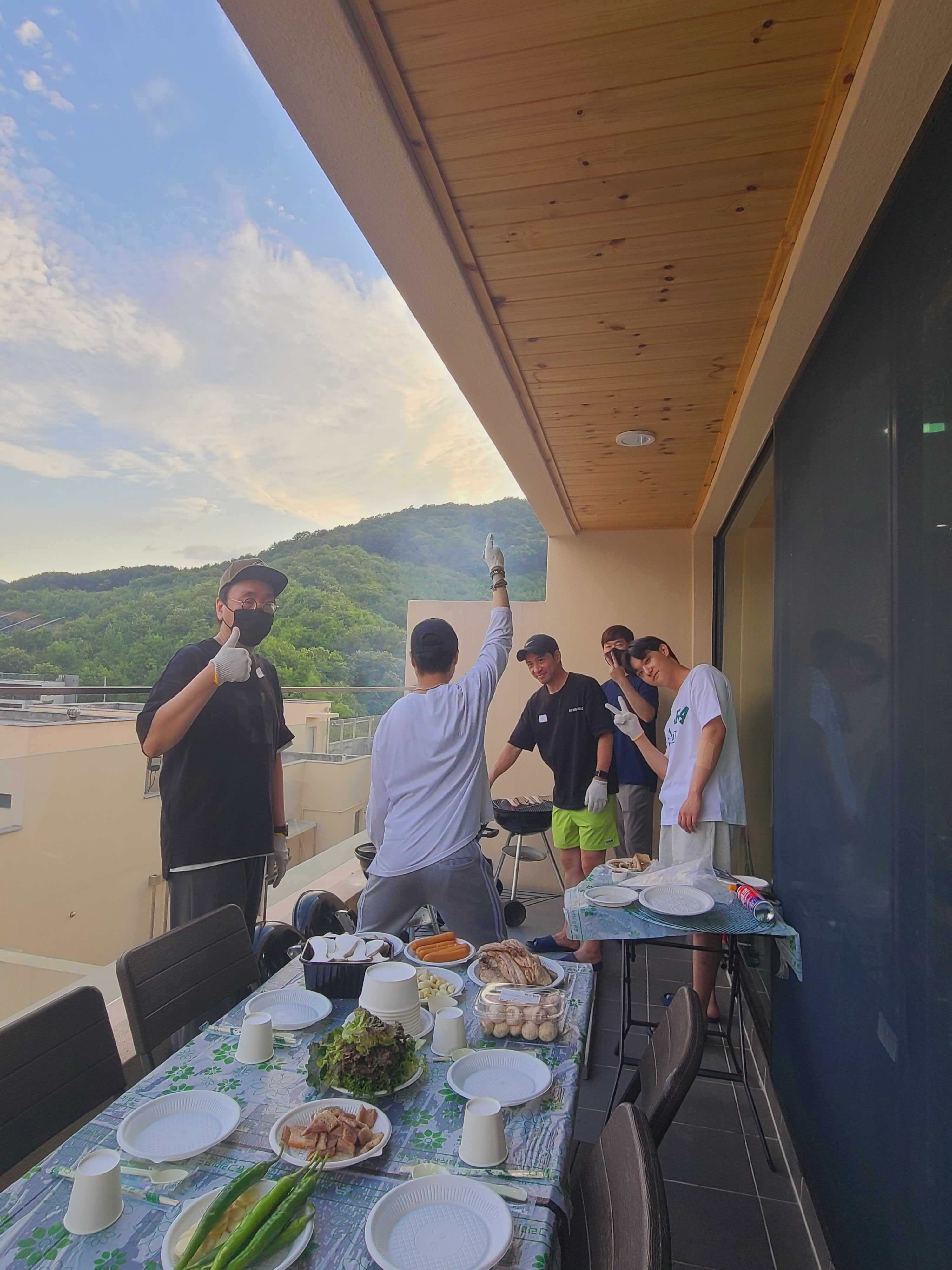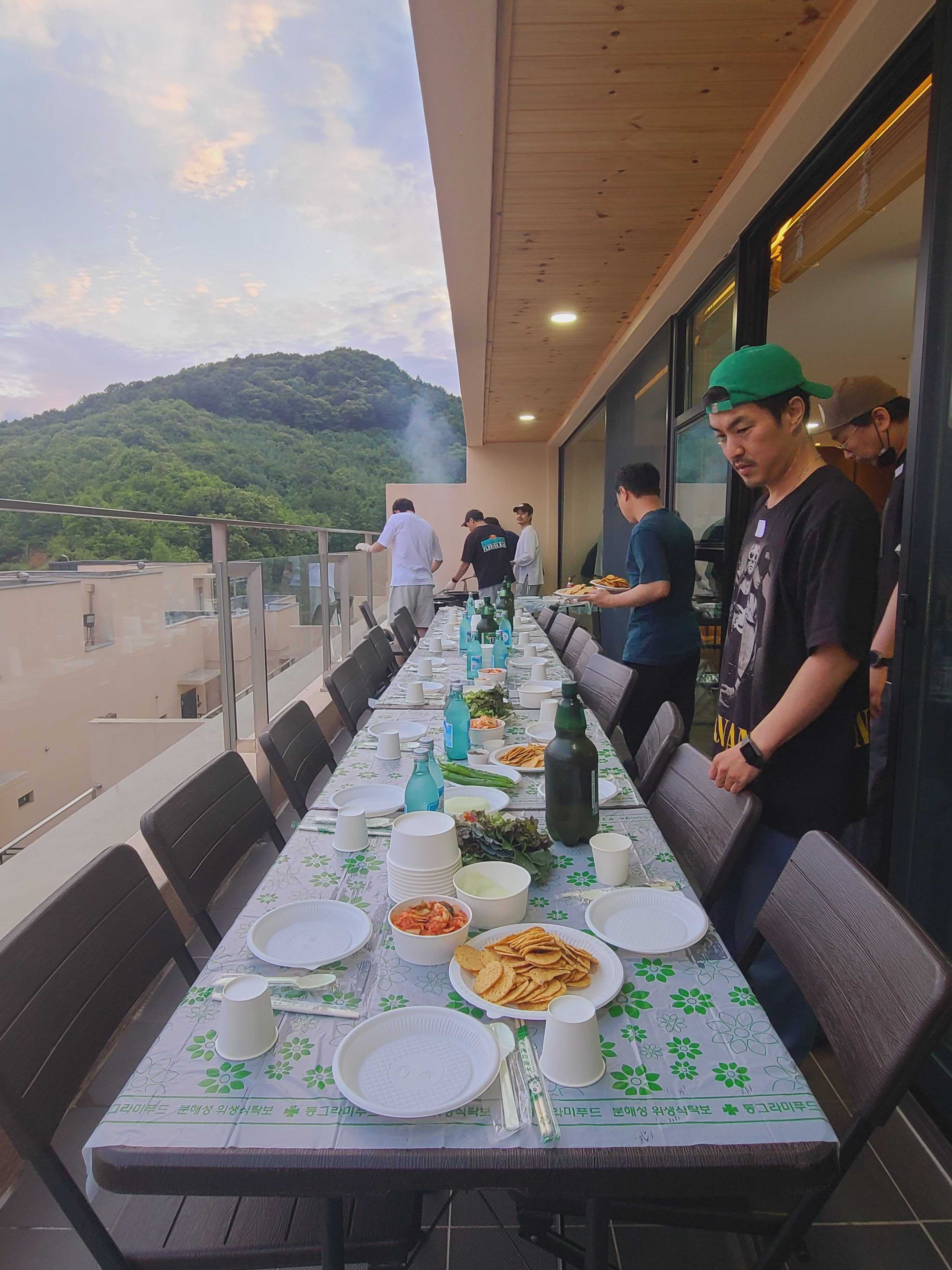 - 그 사이에 먹을 자리 준비와 고기를 굽는 분주한 모습들